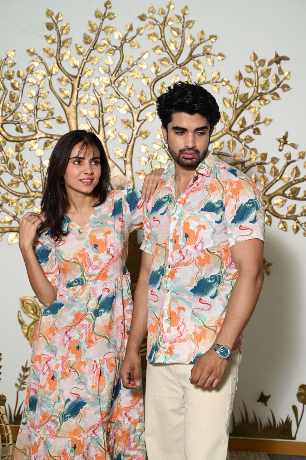 This Abstract Print couple matching outfit includes a women?s flowy cotton midi dress and a men?s short-sleeve printed shirt. Designed with cheerful yellow floral prints, this set is perfect for summer outings, casual gatherings, or twinning on vacations.