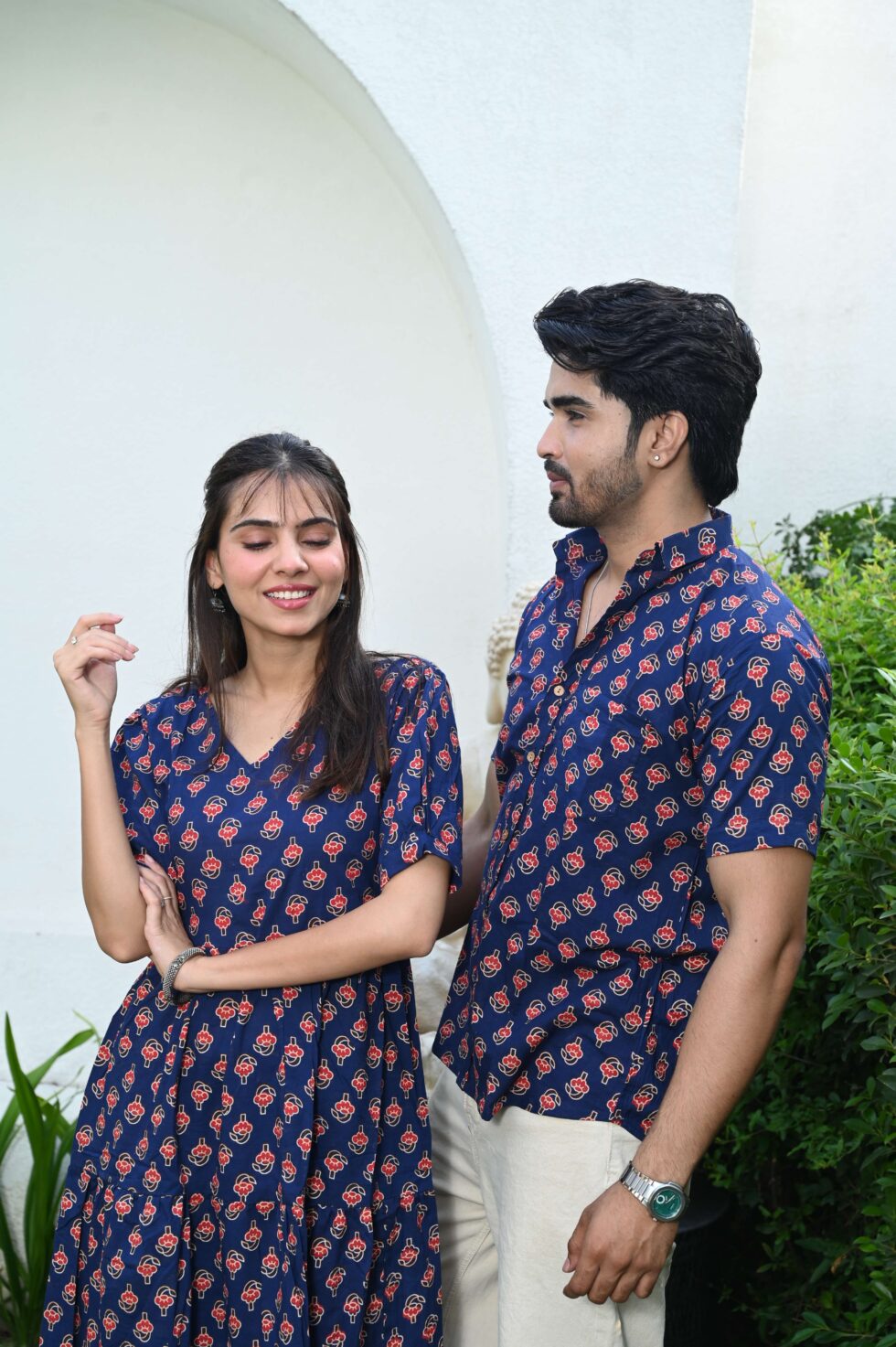 This navy blue matching outfit set includes a women?s midi dress and a men?s short-sleeve shirt, both featuring vibrant red ethnic prints. Perfect for couples who love twinning in style at casual outings, festive gatherings, or vacations.