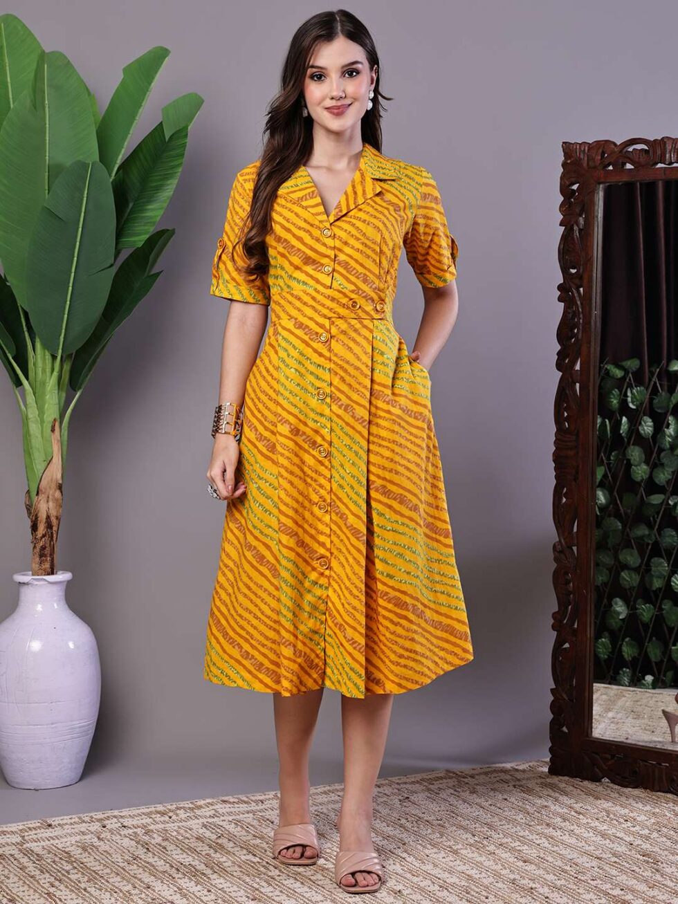 Women’s Yellow Printed Cotton Shirt Dress